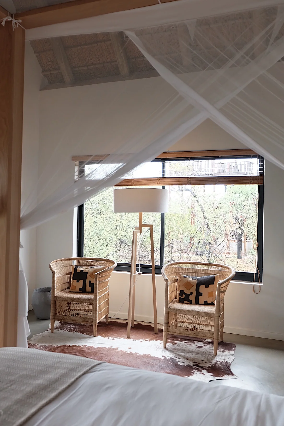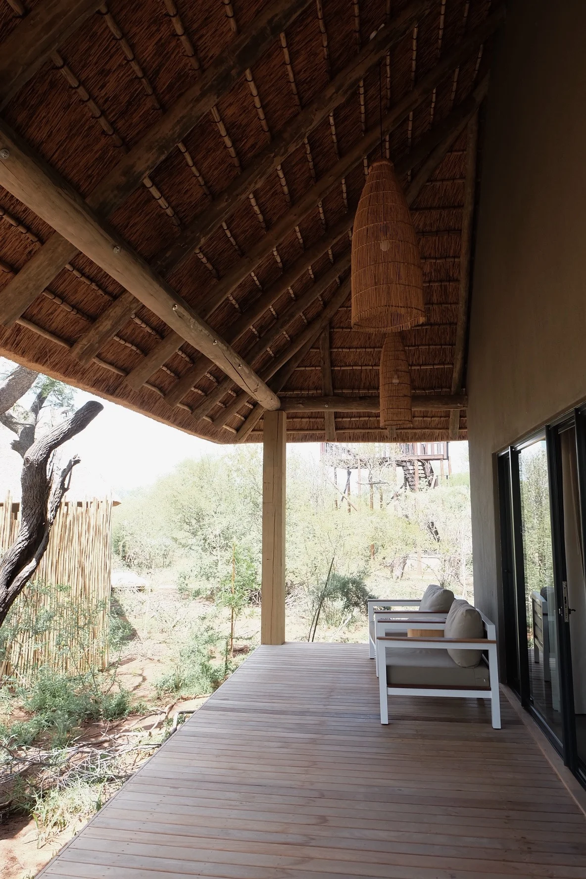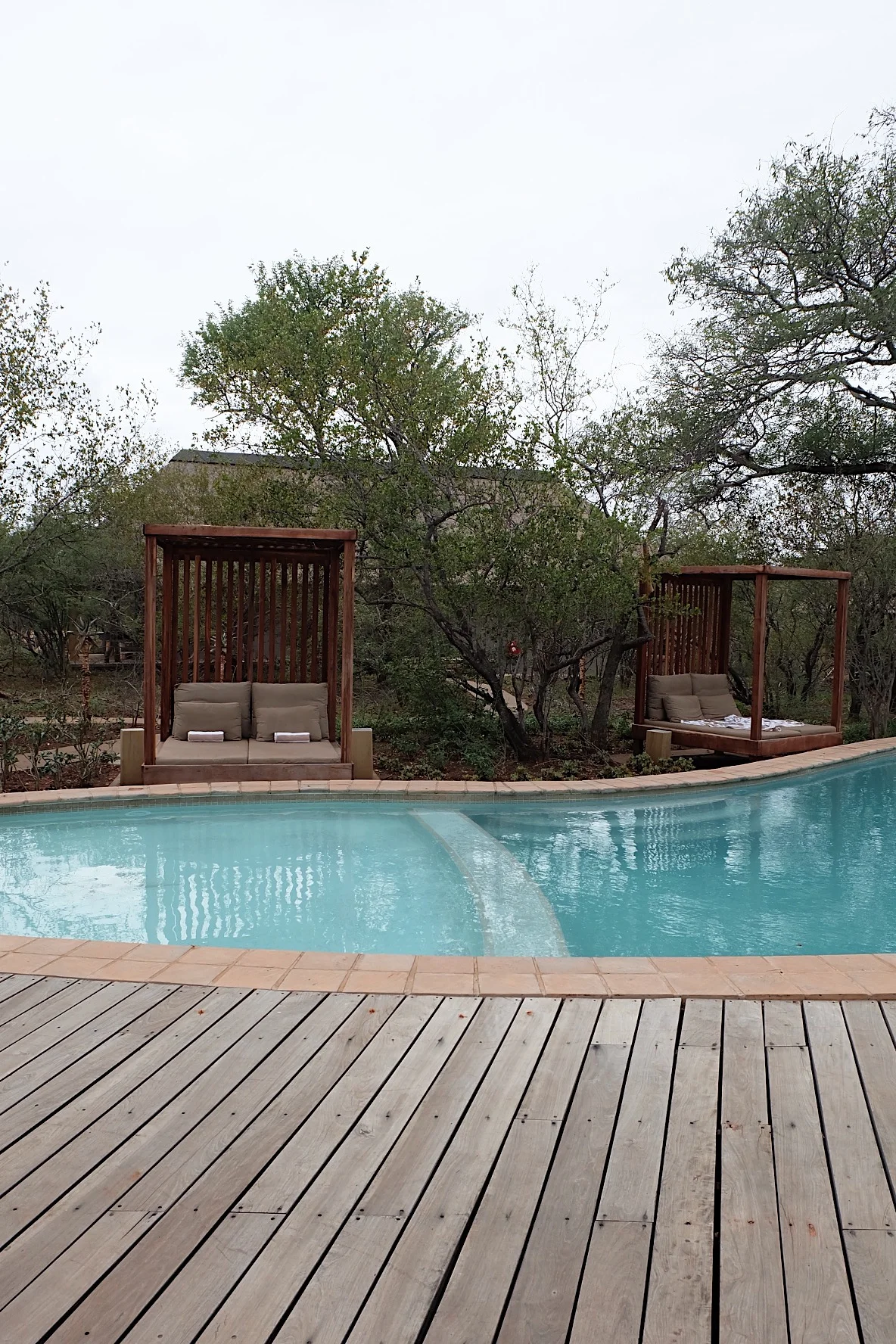 I would have to describe the hotel as modern, chic, and high quality. Our bed was masterly draped in mosquito nets and the mattress felt like a cloud. The animal rug and carved chairs are only some of the South African details throughout the space. My favorite escape was to the deck right outside the sliding doors. The comfiest of bean bag chairs, my history/ romance book, and the sounds of jackals was what made the trip for me. I was in complete happiness.